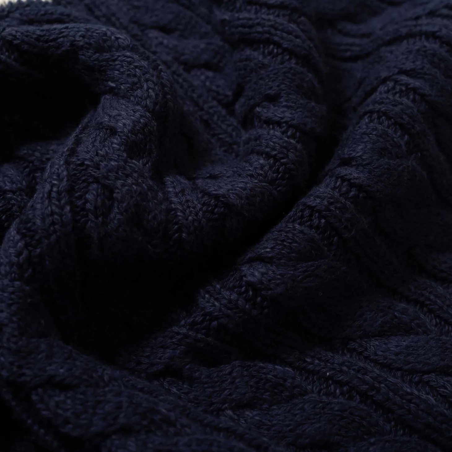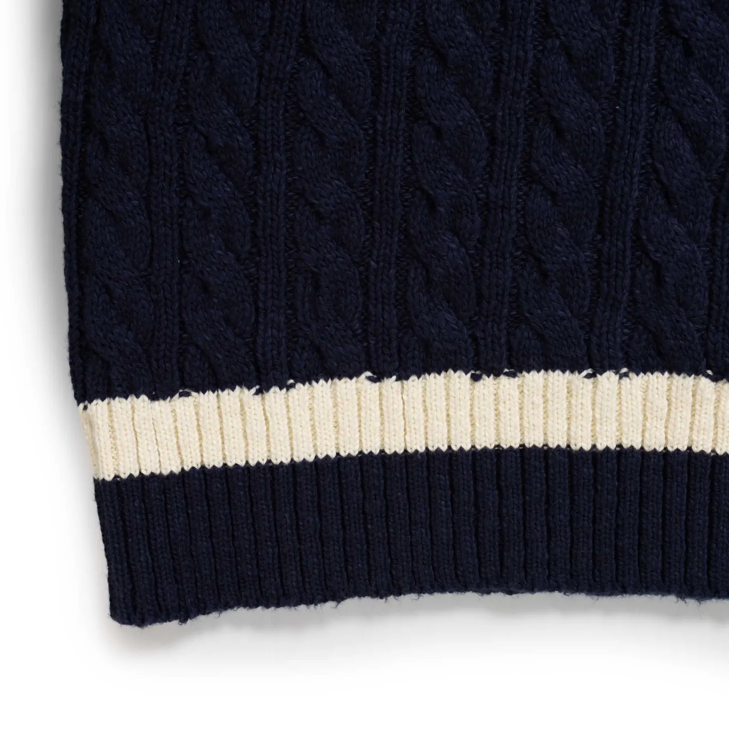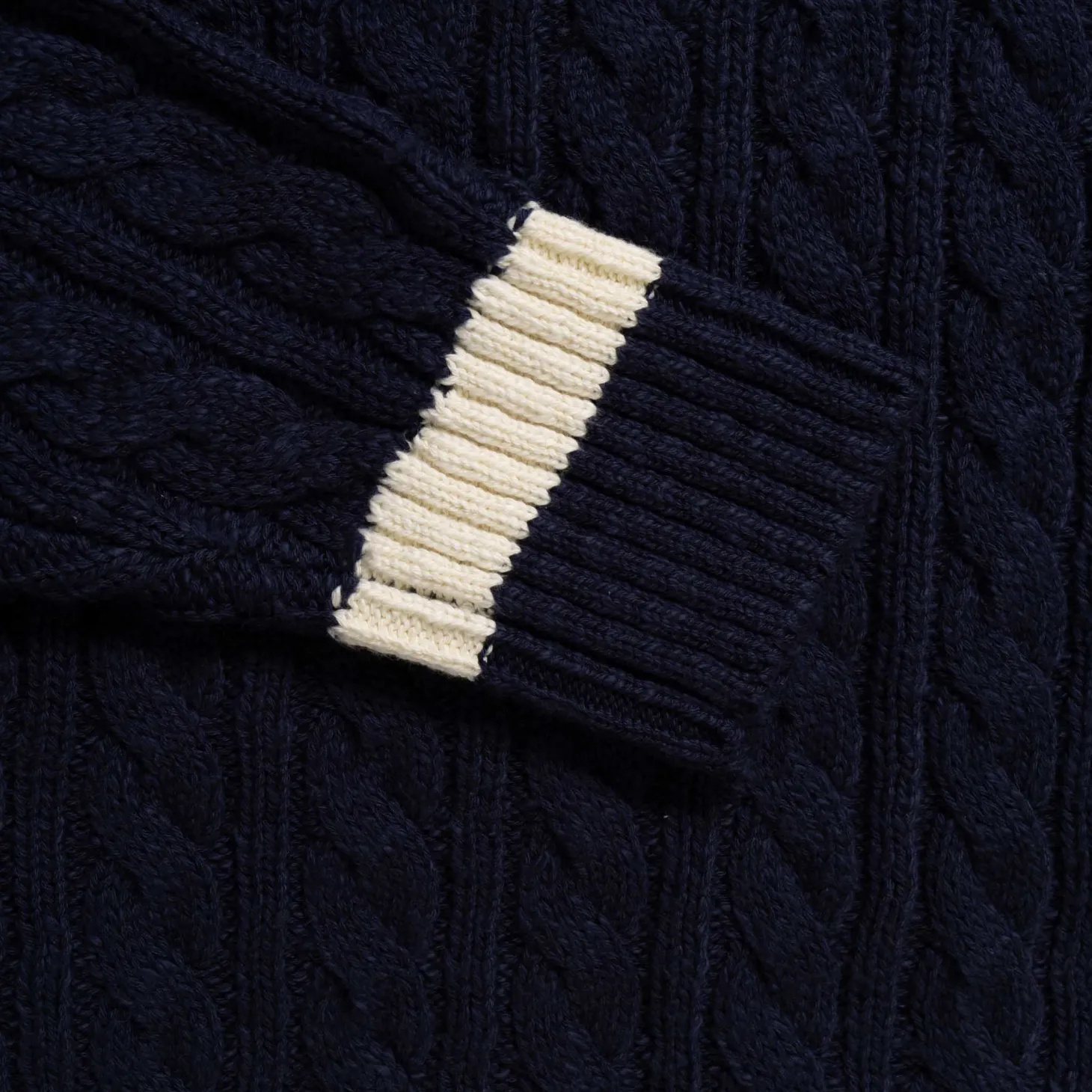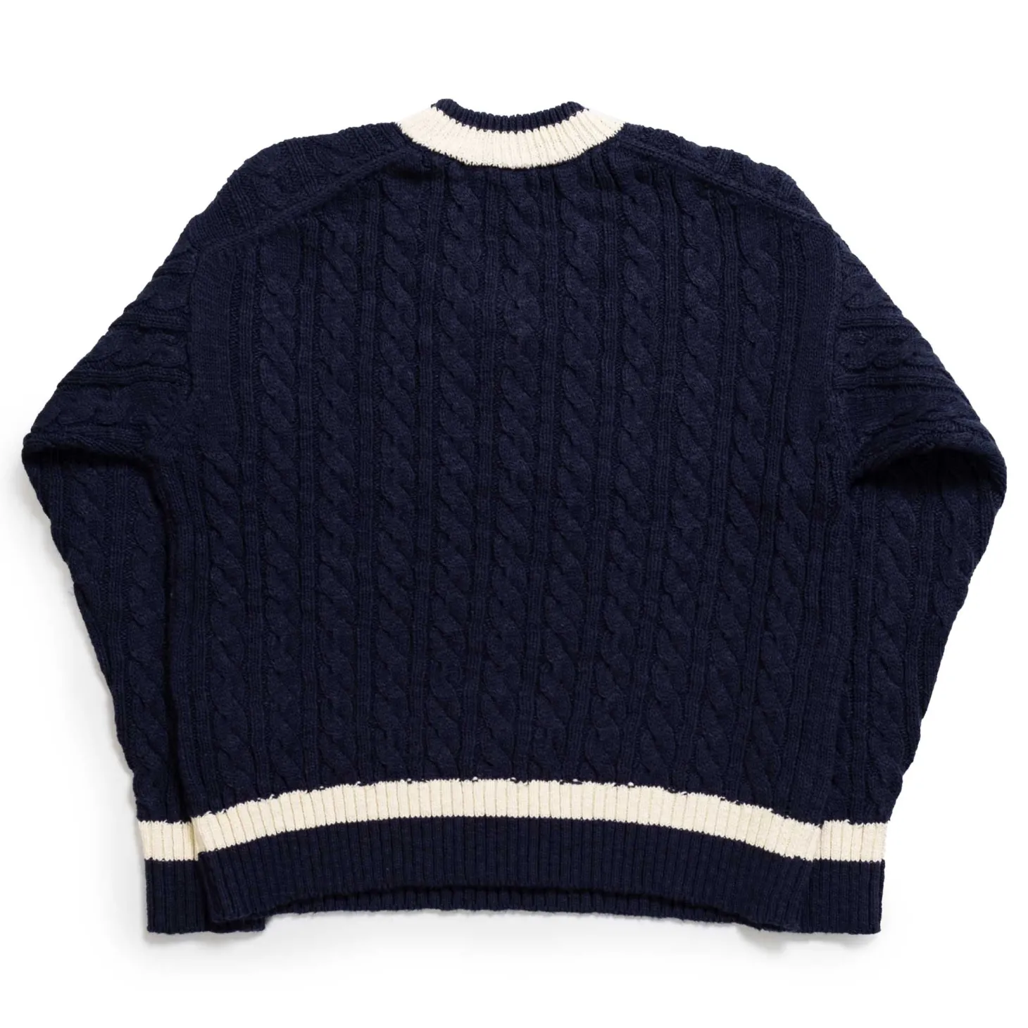 Made in Japan from a 5-gauge slub cotton, with cable knit construction throughout (introduced to make a sturdier knit) while contrasting stripes on the waist and collar would represent team colours, but in this case a nice point of difference. Ribbed hem & cuffs with woven McCoy sportswear label complete the look.