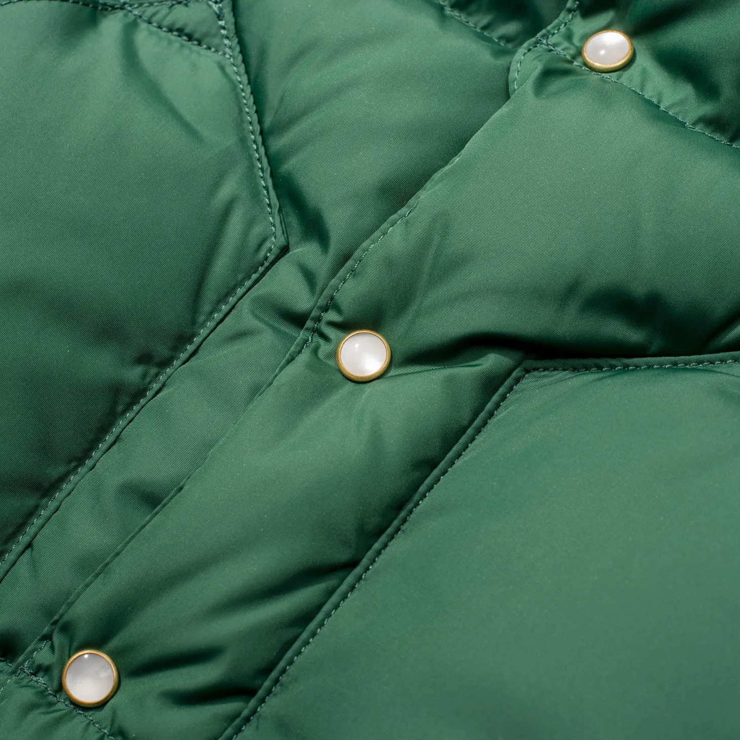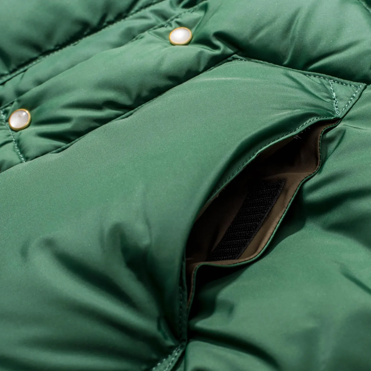 All made in Japan for Warehouse & Co. the Rocky Mountain Featherbed Christy vest is an iconic and enduring style seen commonly in the American West throughout the late ’60s and it’s 70’s heyday. Made to the same styling with a one-piece leather Western yoke laying across the shoulders, mouton fur collar and as close to the original ratio of 90/10 Down to Feather filling. The shell is made from a specially created 70 Denier Nylon which is lightweight and incredibly durable.